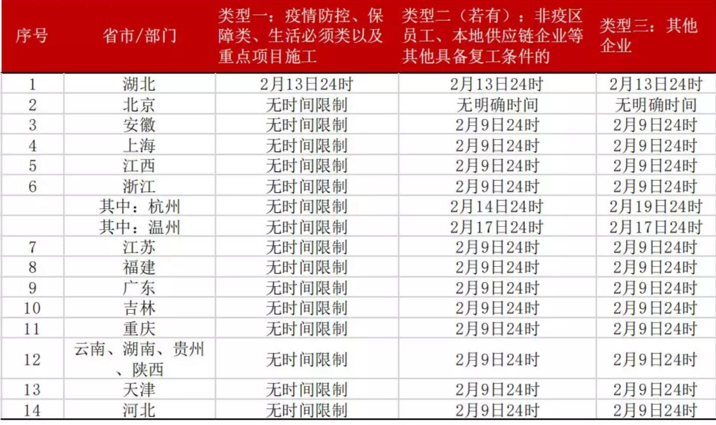 受新型冠狀肺炎疫情影響,今年各行各業(yè)的復工復產(chǎn)堪稱一波三折。1月30日,疫情防控重點物資企業(yè)先行復工;2月3日開始,金融類等部分企業(yè)也開始陸續(xù)復工復產(chǎn);2月10日開始,除了個別省市以外(如湖北、浙江杭州和溫州等)全國30個省市迎來了第一波復工復產(chǎn)潮。