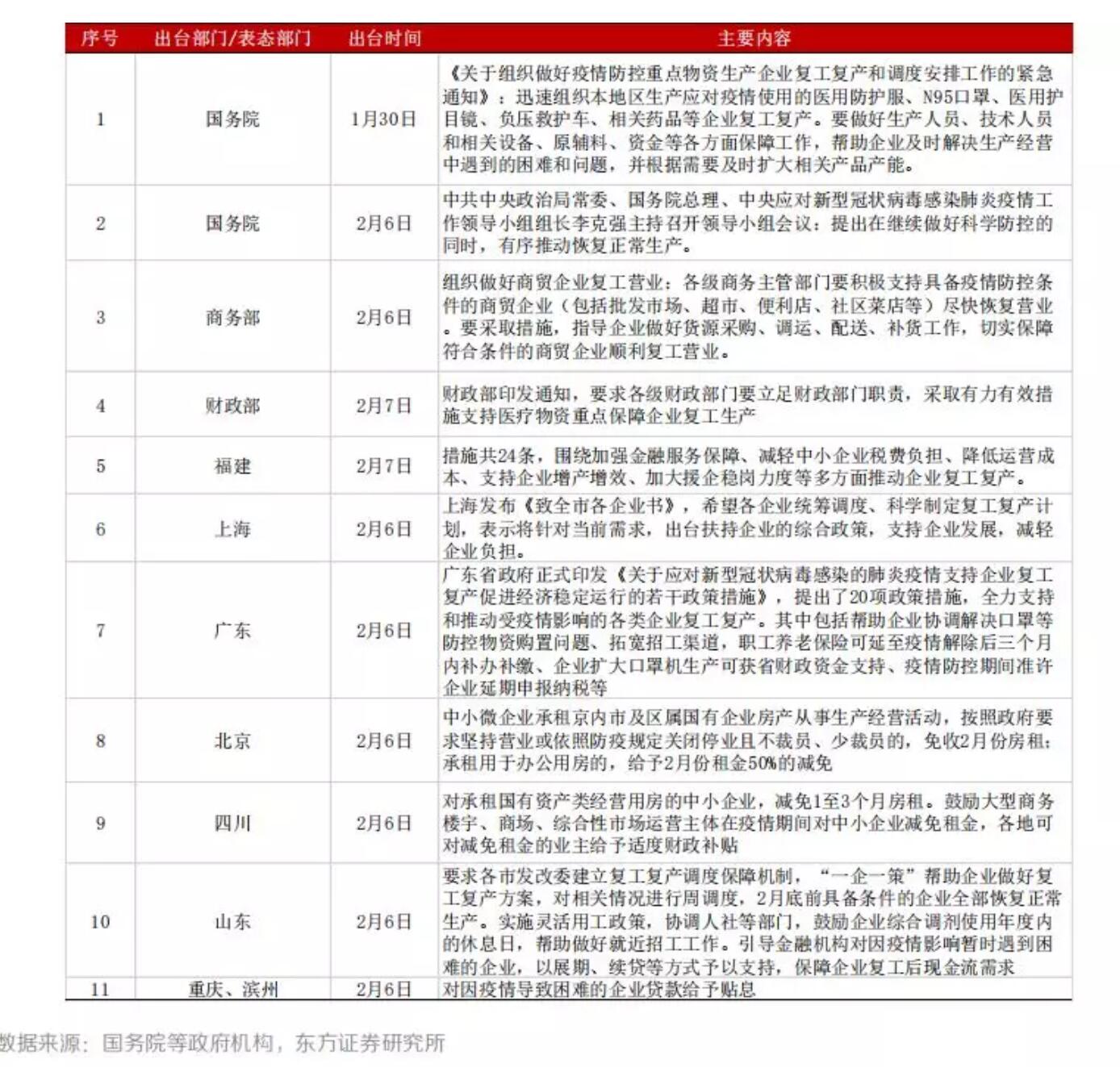 國務院、商務部、財政部、央行等多部門也相繼發(fā)布支持企業(yè)復工復產(chǎn)的政策。各地政府更是出臺了支持企業(yè)復工并嚴控疫情的相關政策。