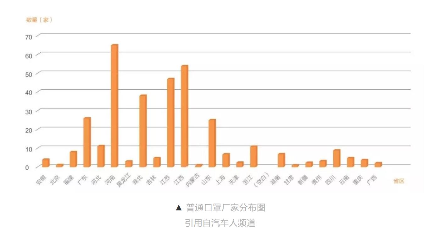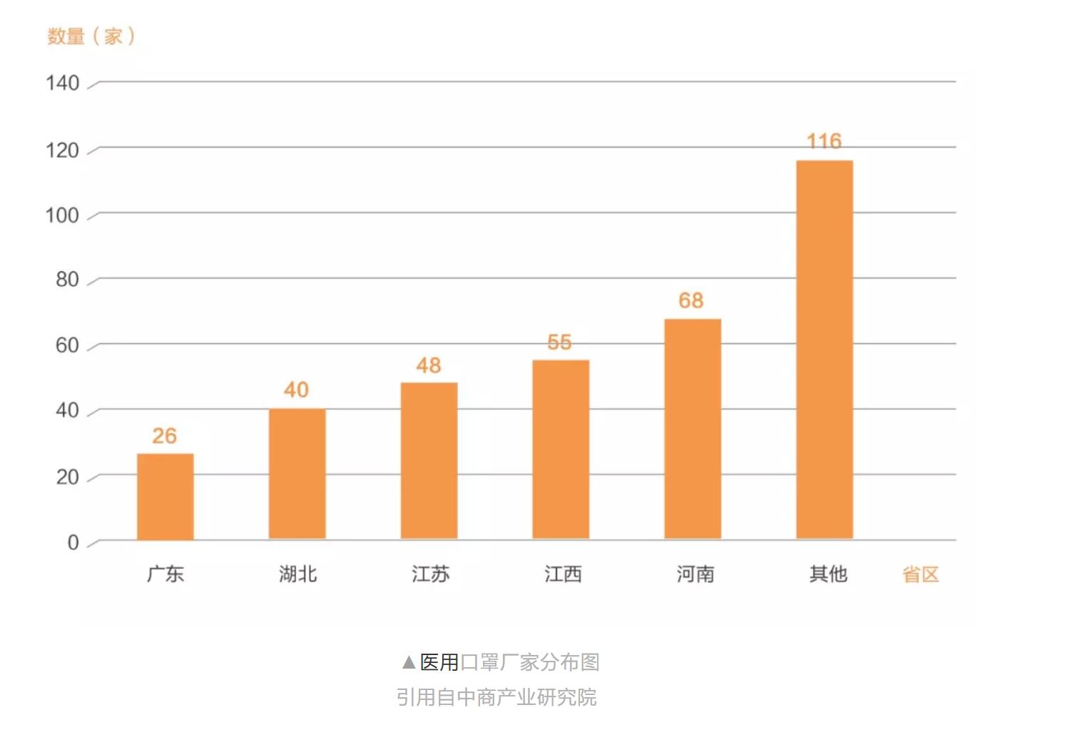 中國(guó)是一個(gè)口罩產(chǎn)業(yè)大國(guó),生產(chǎn)了全球約50%的口罩。在疫情發(fā)生之前,中國(guó)口罩最高日產(chǎn)為2000多萬(wàn)只。數(shù)據(jù)顯示,2015-2019年中國(guó)大陸地區(qū)口罩產(chǎn)業(yè)產(chǎn)值增長(zhǎng)率在10%以上。2019年,中國(guó)大陸地區(qū)口罩產(chǎn)量超過(guò)50億只,產(chǎn)值高達(dá)102.35億元。最快的口罩生產(chǎn)速度120-200只/秒,但一個(gè)解析消毒的標(biāo)準(zhǔn)流程卻需要7天到半個(gè)月。因?yàn)獒t(yī)用口罩采用環(huán)氧乙烷滅菌,滅菌后,口罩上會(huì)有環(huán)氧乙烷殘留,不但刺激呼吸道,還有致癌物。這樣一來(lái),就必須通過(guò)解析方式,使殘留的環(huán)氧乙烷釋放,達(dá)到安全含量標(biāo)準(zhǔn),經(jīng)檢測(cè)合格后,才能出廠上市。下圖為普通及醫(yī)療口罩生產(chǎn)廠家分布圖。