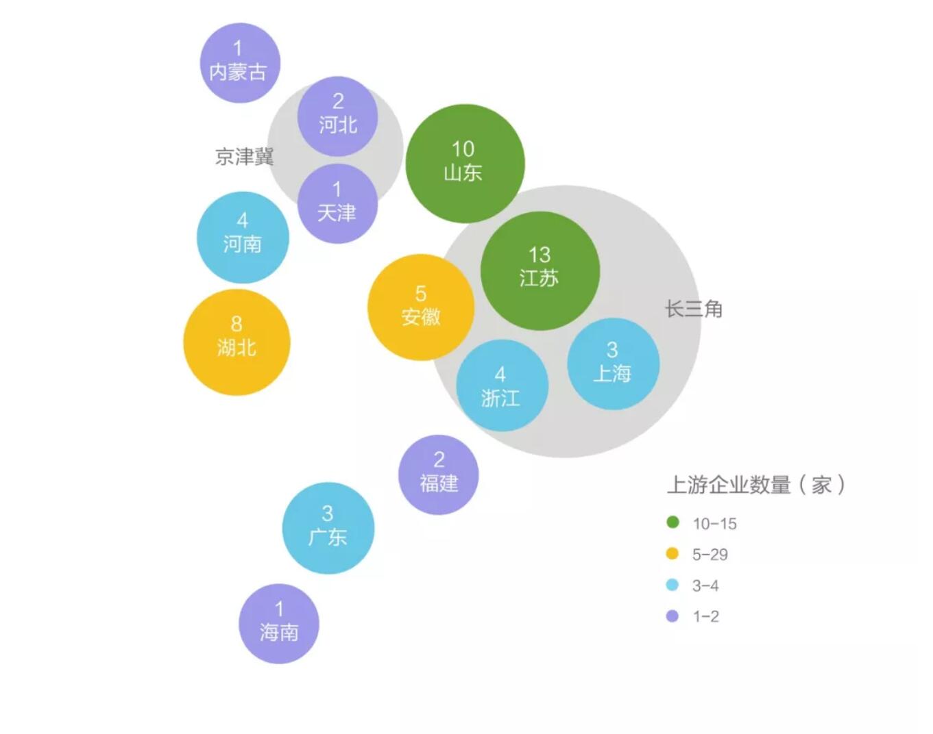 從產(chǎn)業(yè)鏈來(lái)看,在上游,長(zhǎng)三角地區(qū)是醫(yī)用口罩產(chǎn)業(yè)鏈上游企業(yè)分布最集中的區(qū)域,企業(yè)總量占比達(dá)43.8%。其中,江蘇省、山東省企業(yè)分布最多,分別為13家、10家(如圖2)。