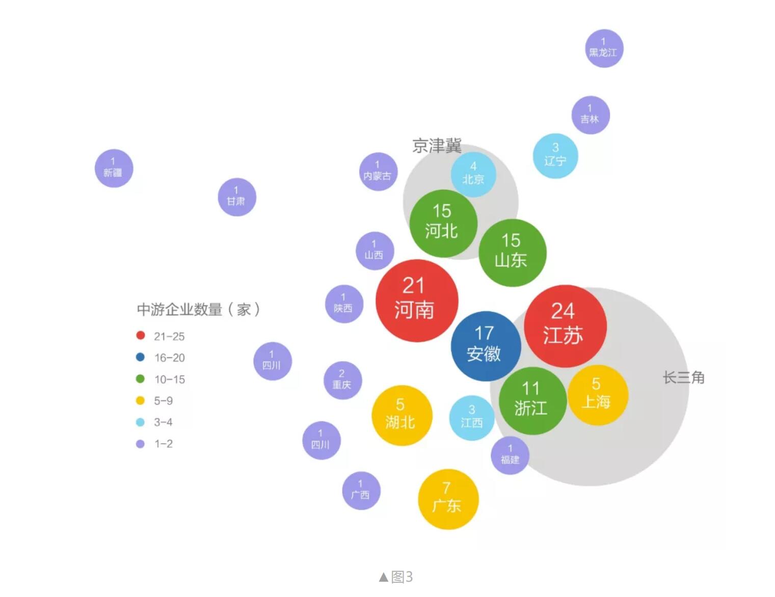 在中游,長(zhǎng)三角地區(qū)是醫(yī)用口罩產(chǎn)業(yè)鏈中游企業(yè)分布最集中的區(qū)域,企業(yè)總量占比達(dá)40%。其中,江蘇省、河南省企業(yè)分布數(shù)量最多,分別為24家、21家(如圖3)。