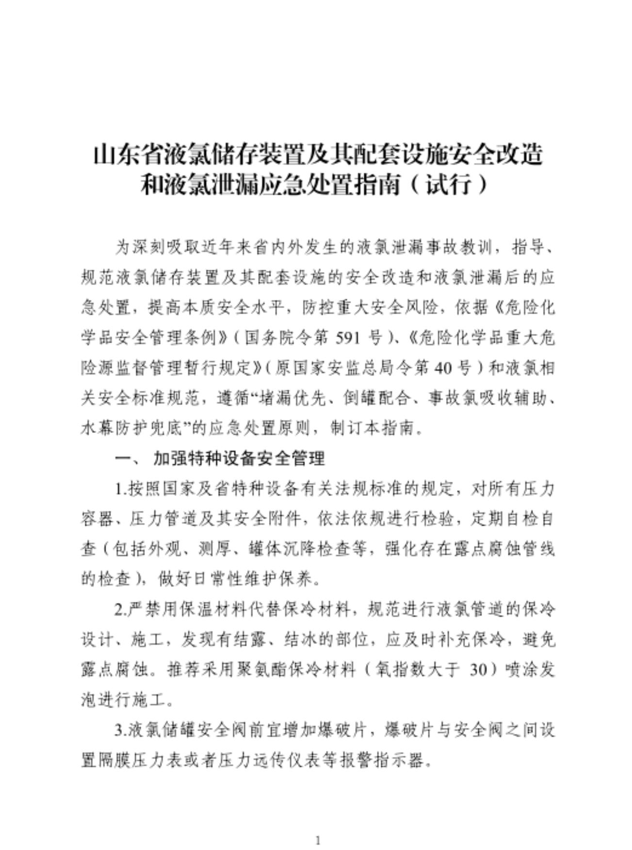 山東印發(fā)液氯儲(chǔ)存裝置及其配套設(shè)施安全改造和液氯泄漏應(yīng)急處置指南(試行)