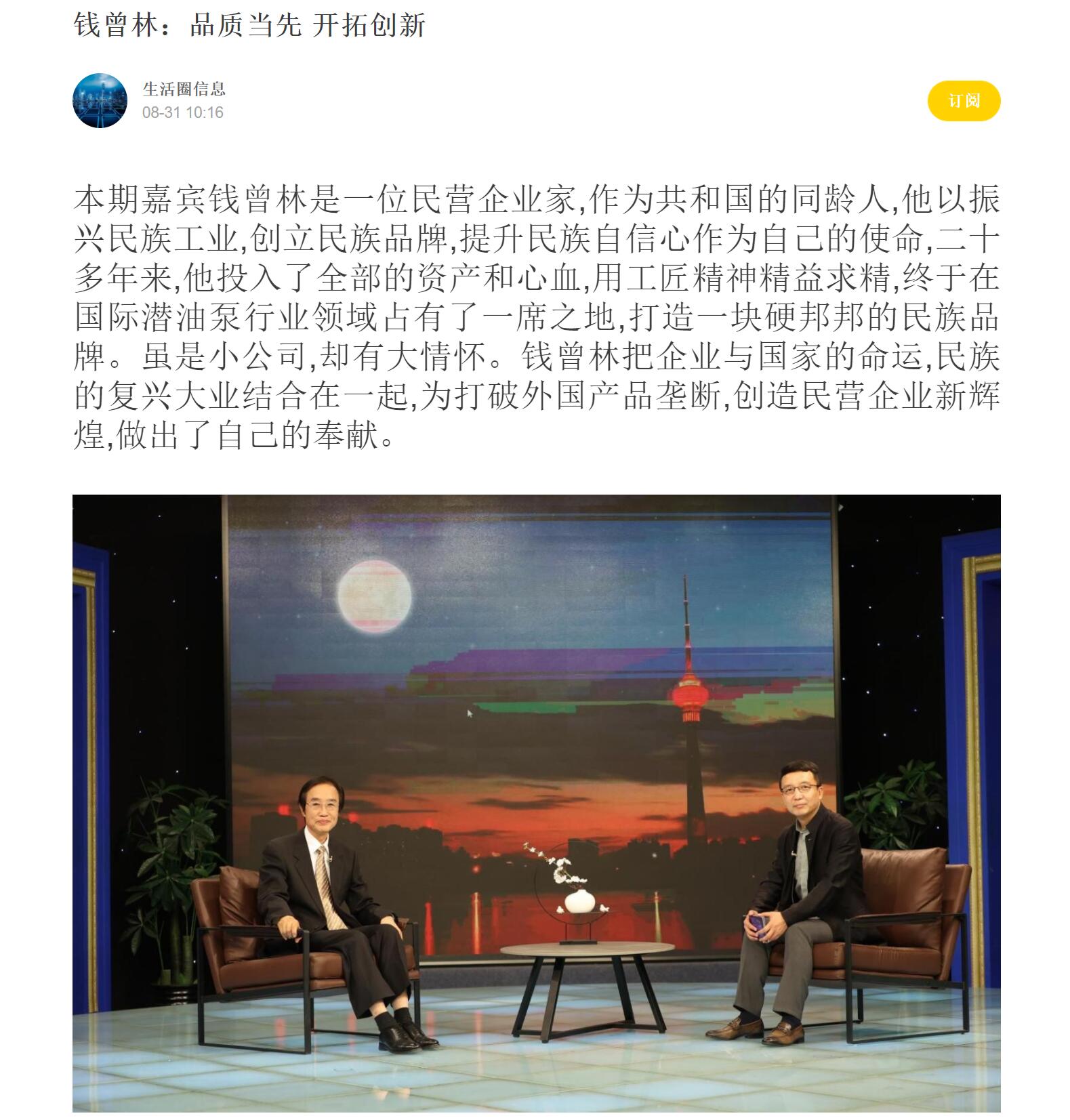 本期嘉賓錢曾林是一位民營(yíng)企業(yè)家,作為共和國(guó)的同齡人,他以振興民族工業(yè),創(chuàng)立民族品牌,提升民族自信心作為自己的使命,二十多年來,他投入了全部的資產(chǎn)和心血,用工匠精神精益求精,終于在國(guó)際潛油泵行業(yè)領(lǐng)域占有了一席之地,打造一塊硬邦邦的民族品牌。雖是小公司,卻有大情懷。錢曾林把企業(yè)與國(guó)家的命運(yùn),民族的復(fù)興大業(yè)結(jié)合在一起,為打破外國(guó)產(chǎn)品壟斷,創(chuàng)造民營(yíng)企業(yè)新輝煌,做出了自己的奉獻(xiàn)。